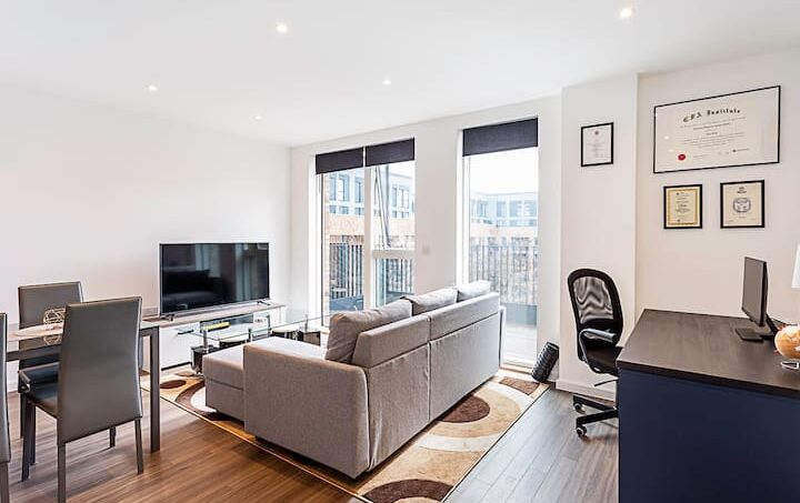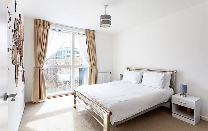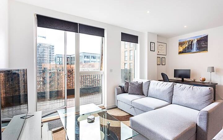 Located on the sixth floor, this beautiful London flat can comfortably accommodate up to 2 people. The smoke-free property features a living room, a bedroom, a bathroom, a kitchen, and a balcony. There is a private courtyard, which is shared between residents of the complex.