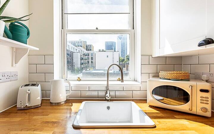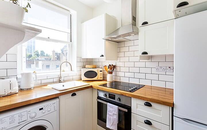 The living room has a comfortable sofa bed, a stylish sideboard, a dining table and chairs. The bedroom features a double-sized bed, night table and ample built-in storage. Large sash windows in the living and bedroom offer the view of the Shard. The kitchen is fully equipped with modern appliances and includes all the cooking utensils that you might need when crafting your breakfast or dinner. The bathroom features a walk-in shower, bathroom vanity and heated towel rack.
