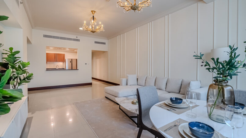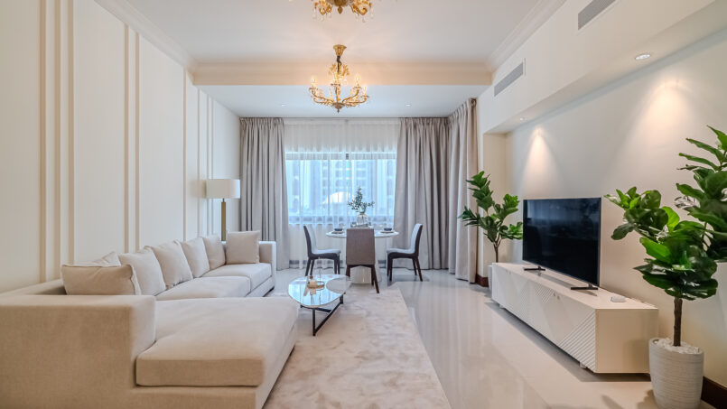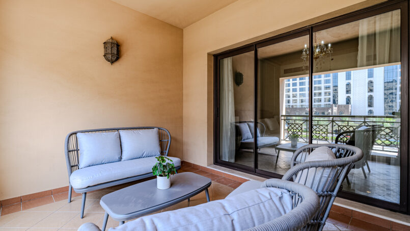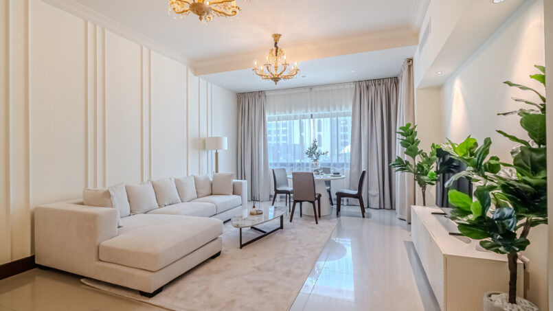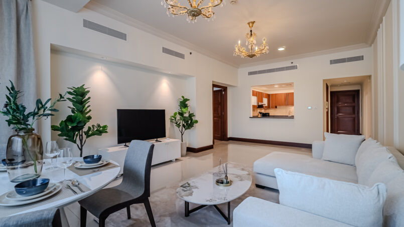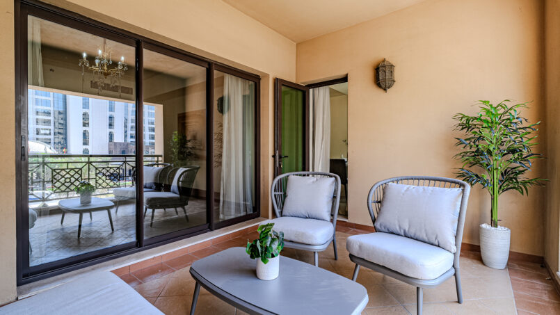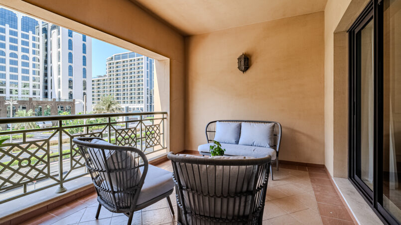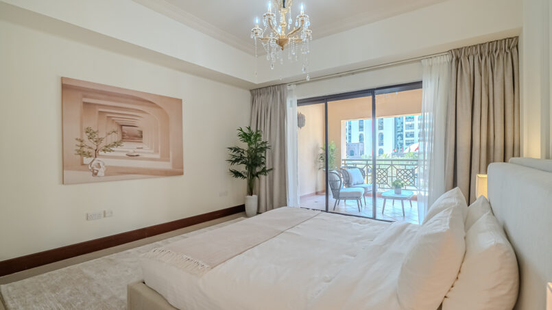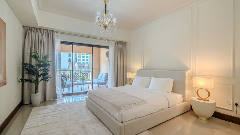 A newly furnished 1-bedroom apartment with balcony located on The Palm – Golden Mile – perfect for those who want to enjoy the serenity of beach life, the apartment’s design is light and airy that leans into a natural and aesthetic look. This brand new 1-bedroom apartment features high-end luxury furniture and a modern design. The layout is spacious and embraces warm undertones that creates a vibrant atmosphere. The tastefully designed living room is styled with a large sofa, smart TV and dining area, creating a simple and fresh look. The rooms are spacious and thoughtfully styled with a minimalistic and trendy touch, the beds are well set with fresh linens and high-quality matrasses. The property features a fully equipped kitchen with all appliances, modern bathrooms filled with toiletries and storage facilities. The apartment is very cozy, spacious, and ready to move in, with all the appliances to ensure a smooth and perfect stay.