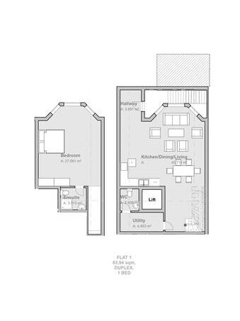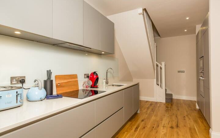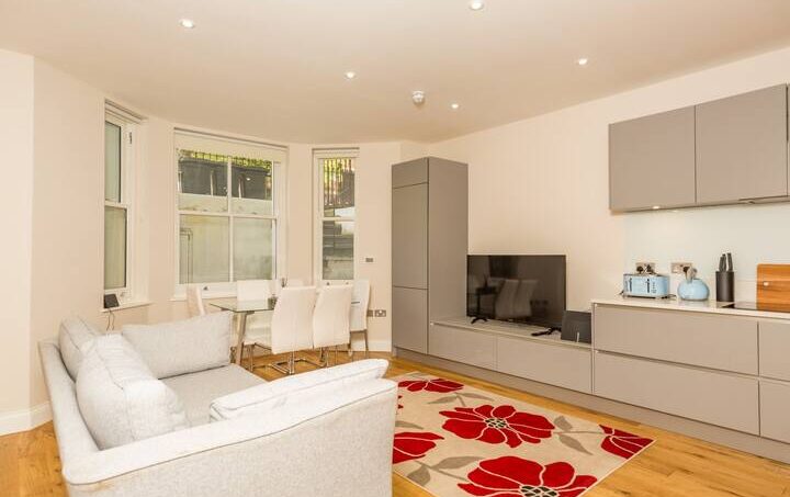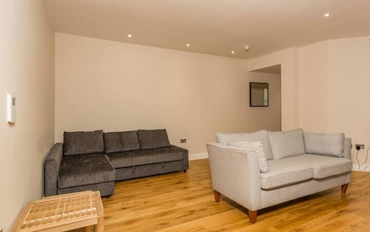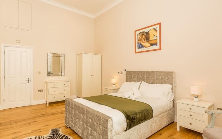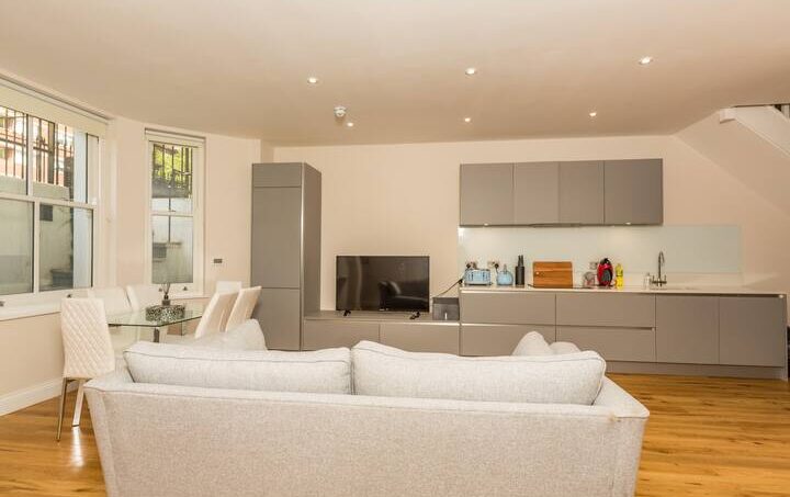 This apartment features its own private entrance leading to the spacious kitchen and living area on the lower ground floor, including a utility area and half bathroom, with stairs to the enormous bedroom with en suite bathroom on the ground floor.