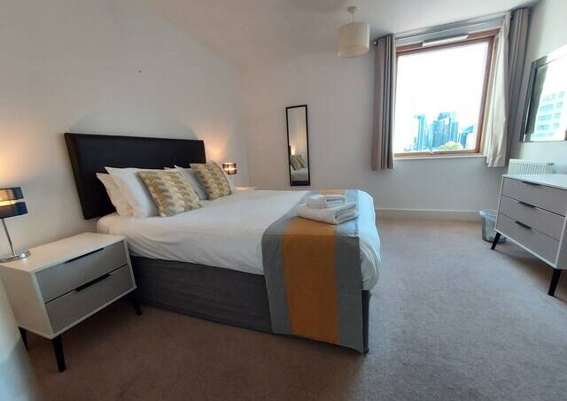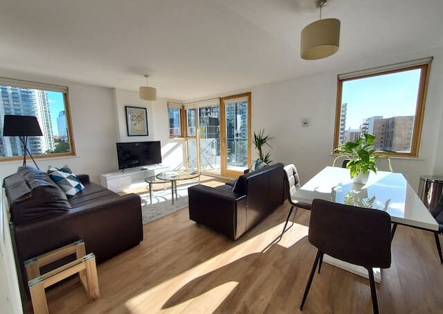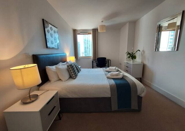 A Spacious, fully furnished 2 bedroom serviced apartment in the popular South Quay neighbourhood of Canary Wharf. 3 minutes to South Quay stations (DLR) and 8 minutes walk from Canary Wharf (Jubilee line) tube station.