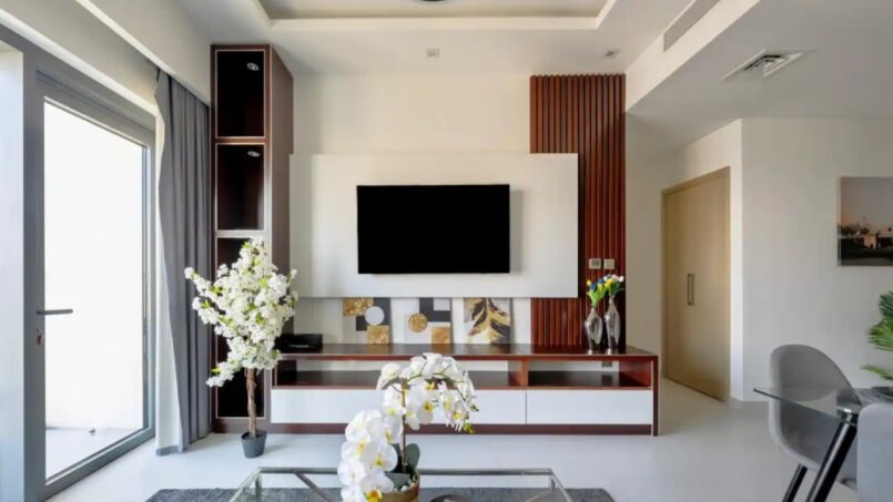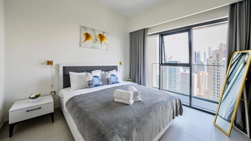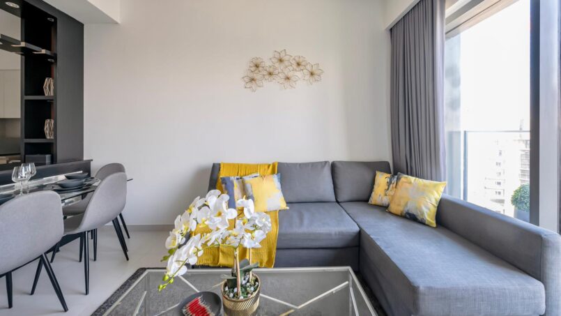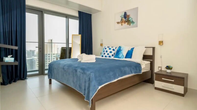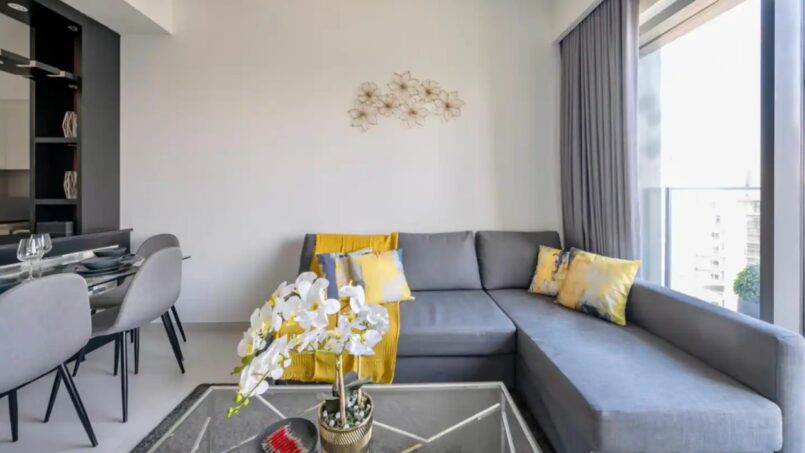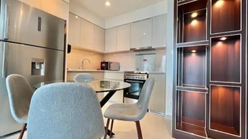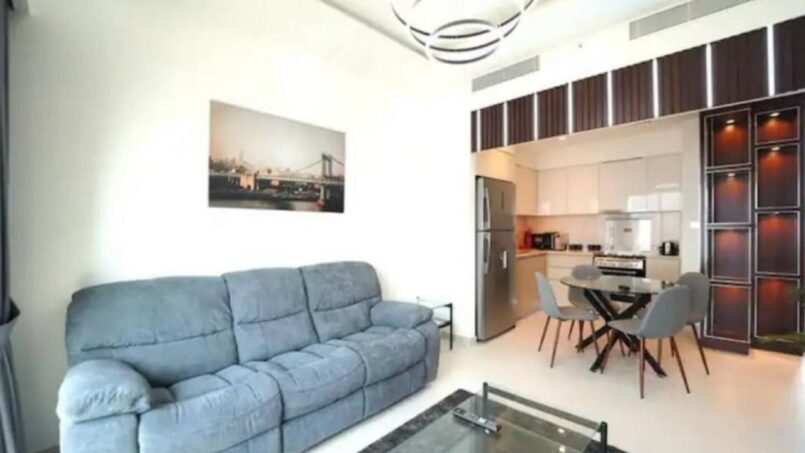 Upon entering this stylish abode, you are welcomed by a spacious and thoughtfully designed living area. The open floor plan seamlessly connects the living and dining spaces, creating an inviting atmosphere bathed in natural light. High-quality furnishings, elegant decor, and modern finishes contribute to the apartment’s chic aesthetic.