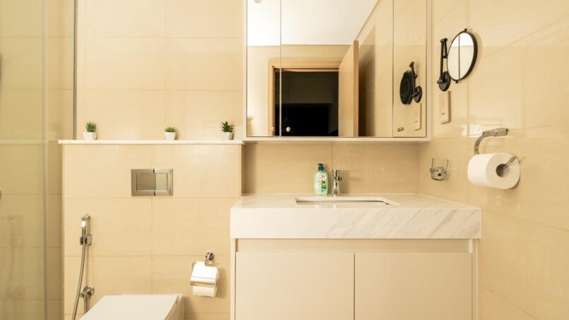 The bathroom is a sanctuary of luxury, featuring contemporary fixtures, a sleek design, and all the amenities you need for a pampering experience. After a day of exploring the city, unwind in the comfort of a deep bathtub or rejuvenate in the spacious shower.