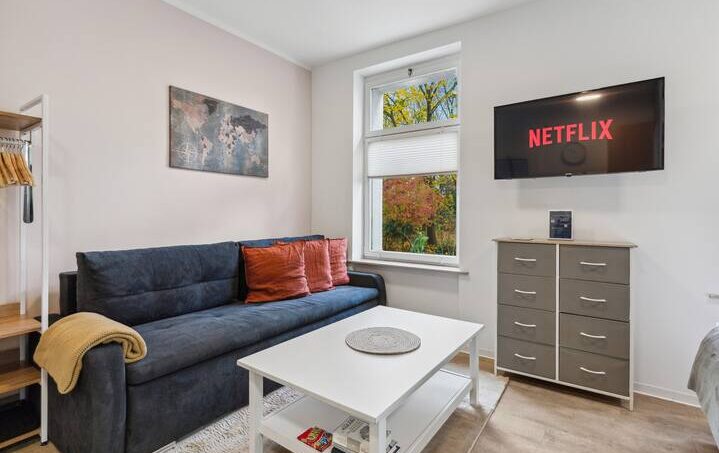 Our accommodation is distinguished by stylish furnishings and thoughtful amenities to ensure a relaxed experience. The apartment features a comfortable queen-size boxspring bed, ample storage space, and a cozy sofa bed for a third person. The well-equipped kitchenette (without cooking facilities) and the modern bathroom with a walk-in shower complete the offering.