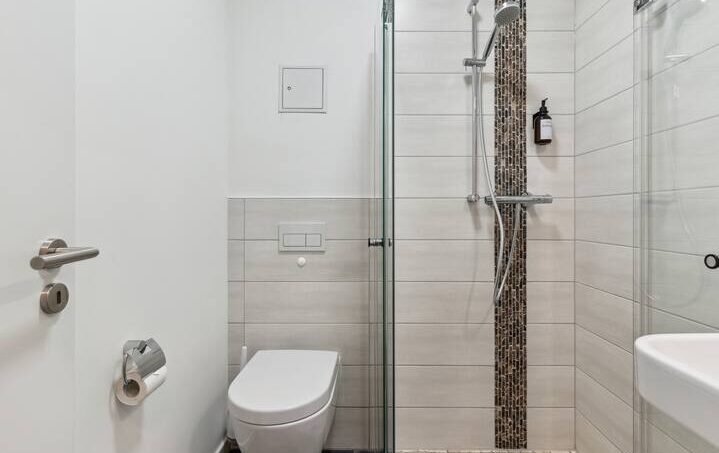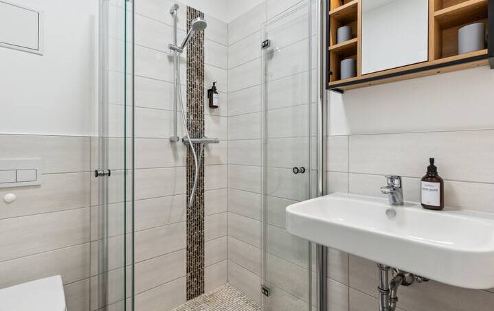 The contemporary bathroom is equipped with a walk-in shower, providing a refreshing shower experience. The high-quality fixtures and modern design contribute to your well-being.