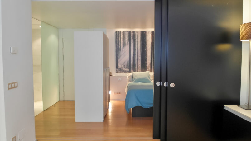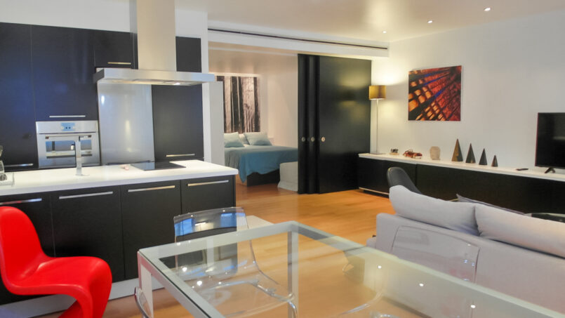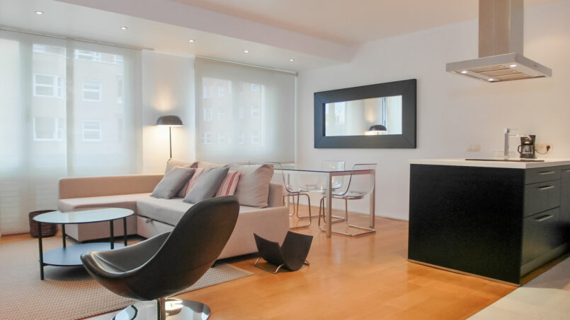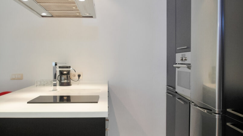 Exterior apartment located on the 5th floor with elevator. It is a fully renovated and decorated apartment in an open plan style, fully furnished and equipped with all the amenities for your stay in Madrid. The living room has a sofa and a single armchair design, the kitchen is American style with a peninsula with silestone countertop, ceramic hob, extractor fan, refrigerator and all high-end appliances. The bedroom is a separate space with sliding door, it has a large closet. Also it has a complete bathroom with double sink, a shower and glass doors, with bed linen and towels provided. The climate control is air conditioning / heating ducts.