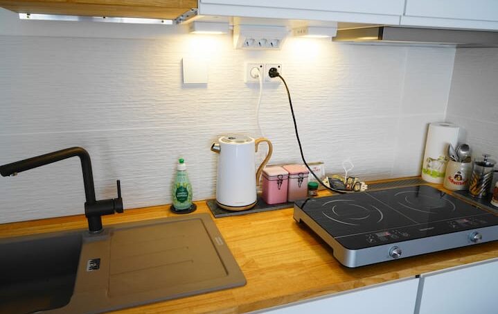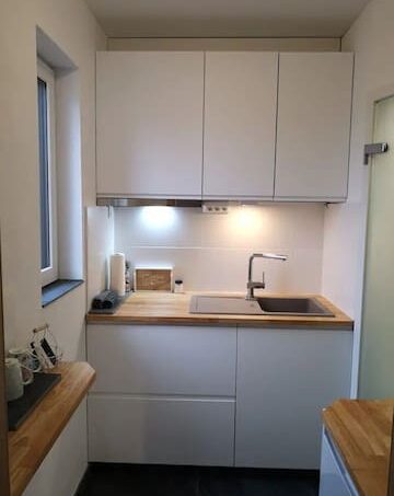 direkter Zugang zu Mini-Küche und -Bad mit WC, beide Räume sind funktionell kompakt und schmal, s. Fotos & Grundriss