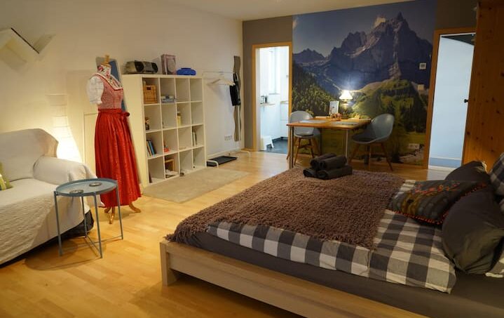2 große luxuriöse Appartements mit je eigenem Zugang, Bad und Küchenzeile – das gesamte OG! In unmittelbarer Nähe Supermarkt, Bäcker, Apotheke, Drogeriemarkt, Biomarkt, Mietwagen. Bushaltestelle 2 Minuten, direkte Busse zu BMW, Allianzarena (U Kieferngarten), MOC, MTC. Öffentliche Verkehrsmittel: Schwabing 20 Min., Innenstadt 30 Min., Oktoberfest 37 Min. Flughafen (MVV 60 Min/Auto 25). Perfekt für Autos; 5 Min zu A99 Salzburg/Nürnberg/Stuttgart/Lindau. Mehrere kostenlose Fahrräder verfügbar.
