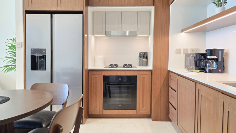 – Open kitchen | fridge, stove, microwave, cookware, utensils