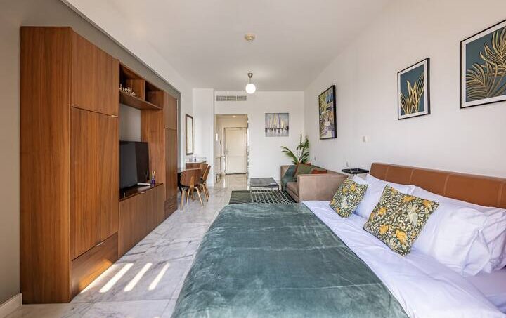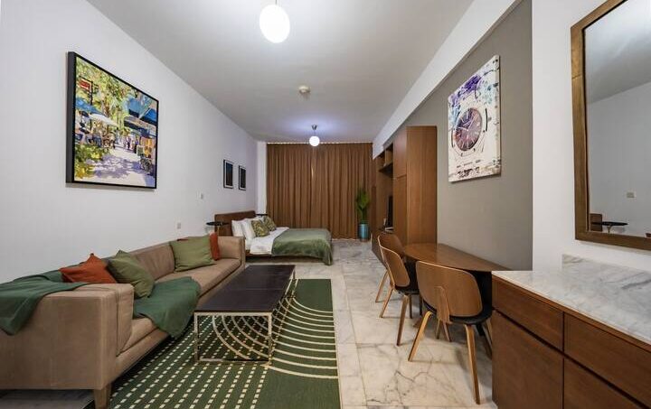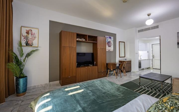 – Studio equipped with king-size bed, plush sofa, a flat-screen TV, and dining area