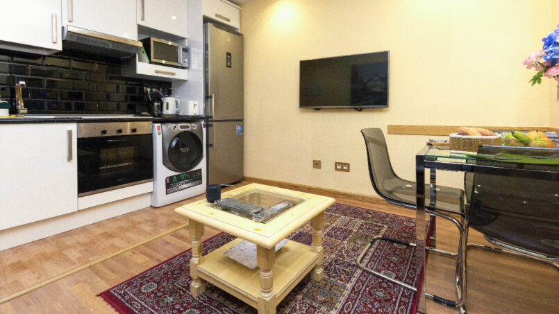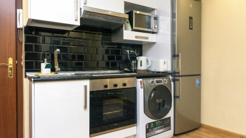 Cocina totalmente equipada con microondas, nevera de gran capacidad, cocina y combinación de lavadora/secadora de horno. apartamento tiene dos puertas para acceder a ella, la primera es con código personal que se va cambiando con frecuencia y la segunda con una llave normal. La puerta del edificio también se habré con una lleve electrónica. Todo ello os lo explico a su llegada!