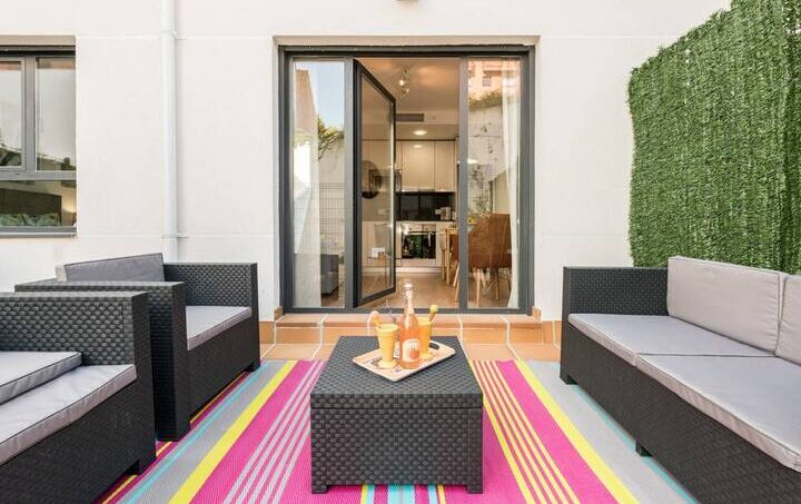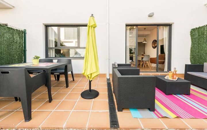Estupenda Terraza- Jardín equipada con sofás, mesa, sombrilla y manguera.