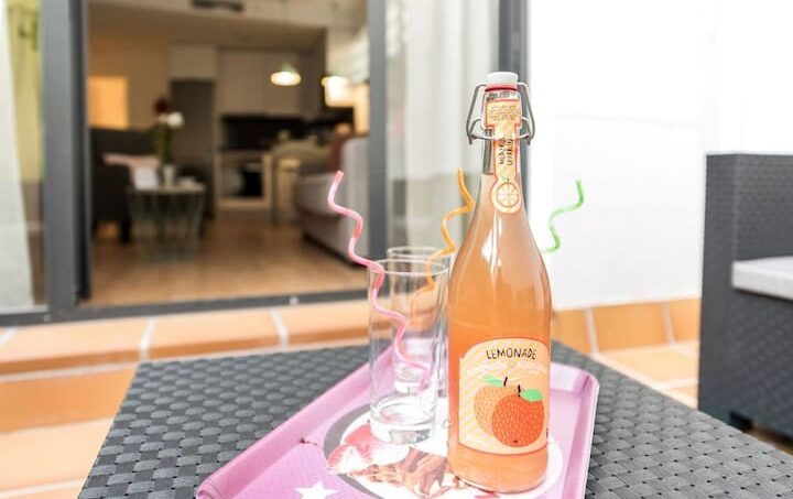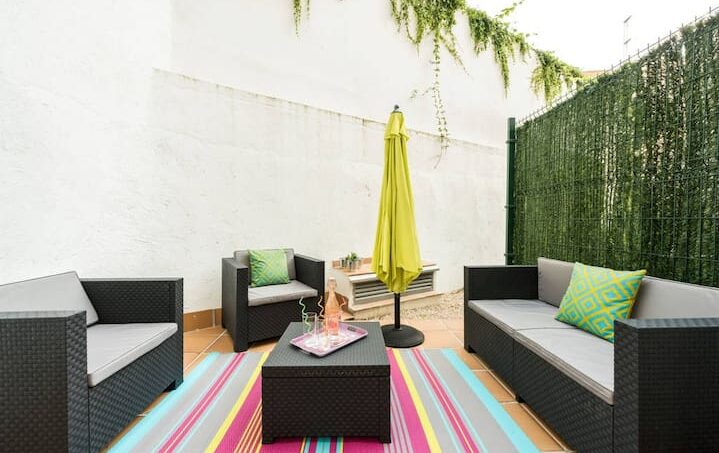 Estupenda Terraza- Jardín equipada con sofás, mesa, sombrilla y manguera.