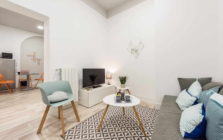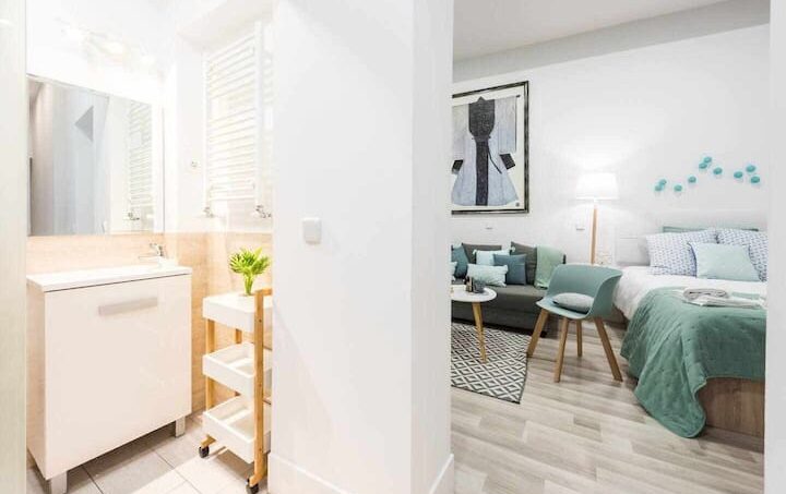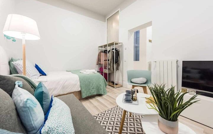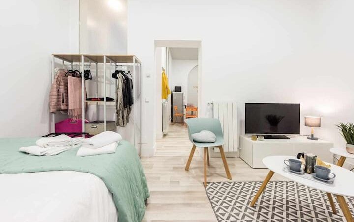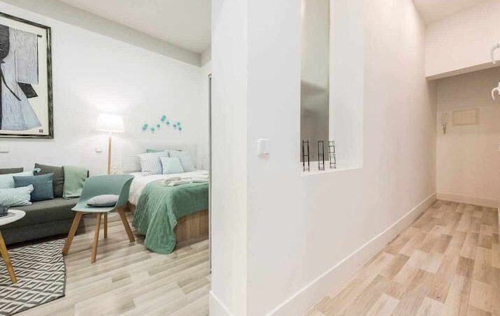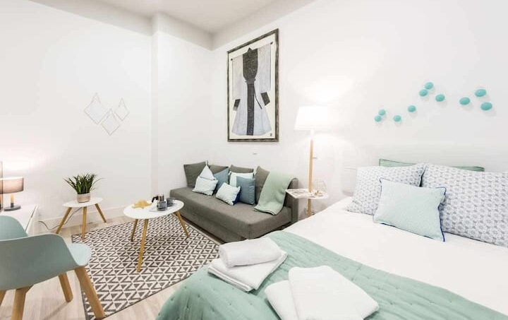 Estudio de 40 m2 recién reformado. Cocina amplia y completamente equipada. Baño con ducha. Cama de matrimonio y sofá cama para dos. Mi estudio, no tiene dormitorio separado. Los techos son altos, por ser una casa clásica, y hay un ventanal en la cocina que da al patio. Es un estudio interior, aunque luminoso y muy silencioso.