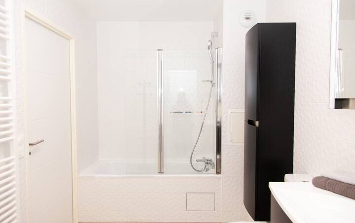 → BAIGNOIRE avec réglage de température, serviettes de bain, tapis de bain, gel douche, shampoing et SECHE-CHEVEUX