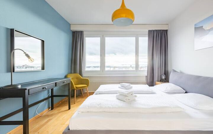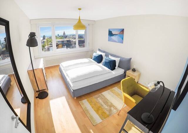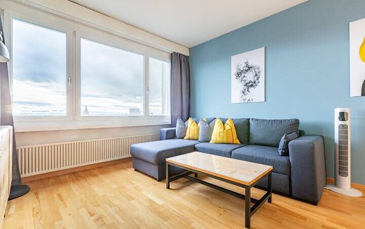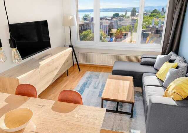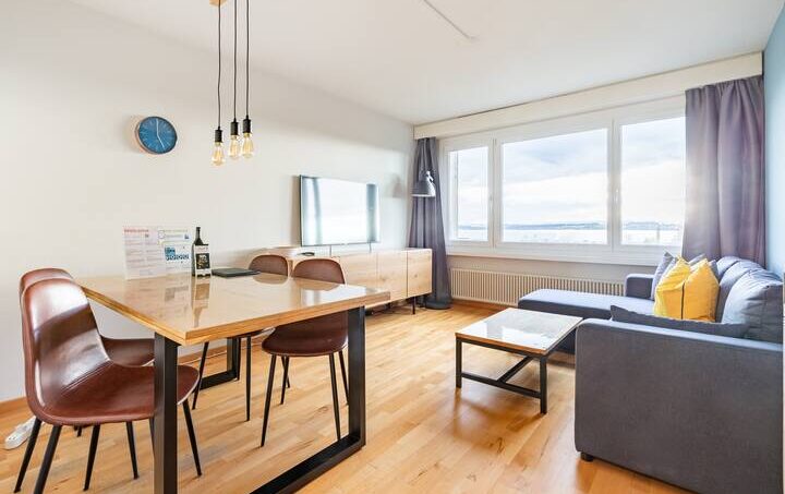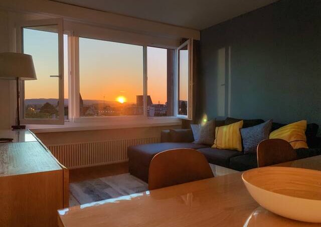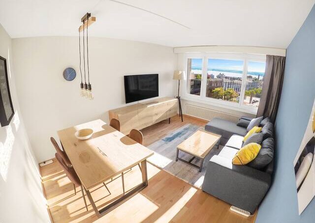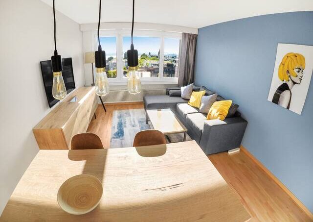 Cozy 2-room apartment on the 6th floor overlooking the lake, the Alps and the city.