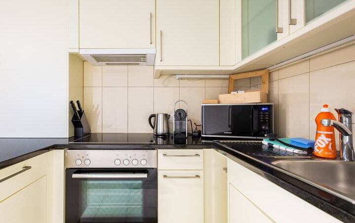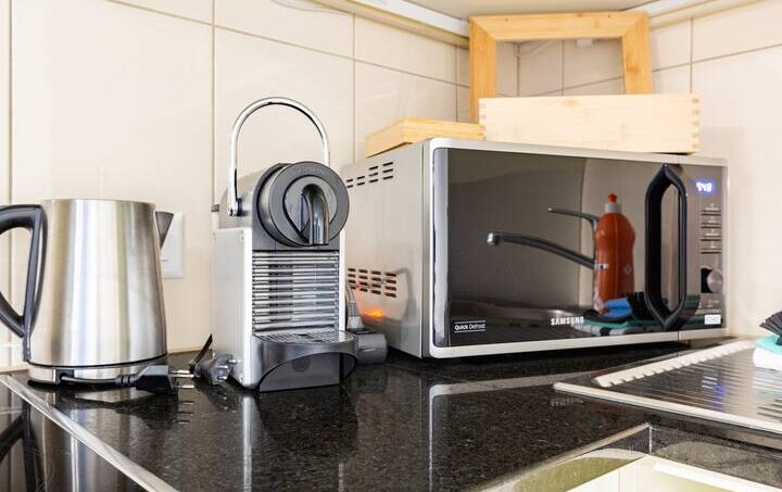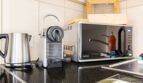 The kitchen is fully equipped with dishes for 4 people, an electric stove, oven, microwave, kettle, dishwasher, fridge with freezer, a separate freezer and a De’Longhi Nespresso machine.