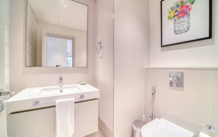 Treat yourself to a spa-like experience in the elegant bathroom, where a walk-in shower and a generous vanity unit await your pampering desires. Wash away your worries and emerge feeling refreshed and rejuvenated, as if you’ve just stepped out of a luxurious retreat.
