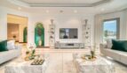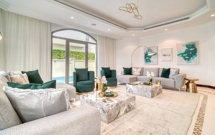 Plush sectional sofas in woolly beige fabric adorned with delta green pillows enhance your viewing experience as you watch TV or enjoy the magnificent Palm Jumeirah views from your balcony or terrace. For an entirely different experience, you might want to cool off in the private pool or marvel at the lush gardens outside, which are filled with vibrant flowers and greenery. Feeling hungry? No problem, the kitchen is stocked with all the necessary appliances for a quick meal or to prepare something from scratch if you wish.