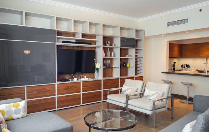 The contemporary lounge area features a comfy sofa, two lounge chairs, a coffee table, and a flat-screen television where you will enjoy your movie nights with your loved ones.