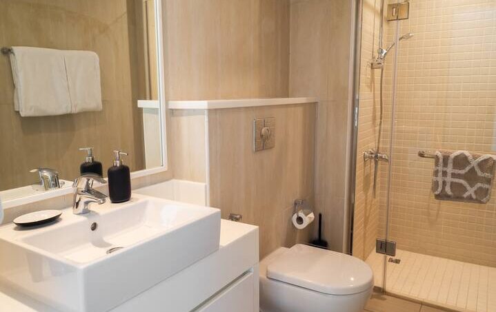 The other two bedrooms feature a king-sized bed, two bedside tables and lampshades. An en-suite bathroom features a shower, a toilet and a sink.