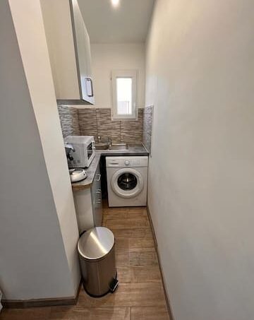 Cuisine équipée avec plaques de cuisson, machine à café, grille pain, Four encastré, micro-onde, Frigo-congélateur et Machine à laver.