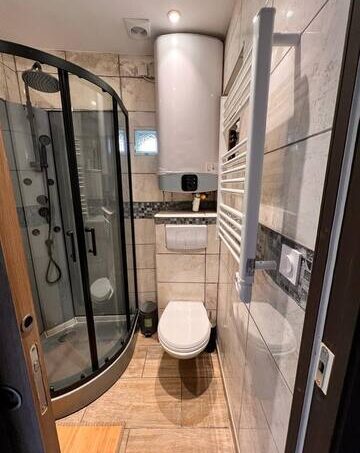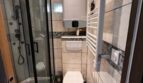 Petit salle d’eau avec une douche et toilette.