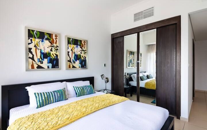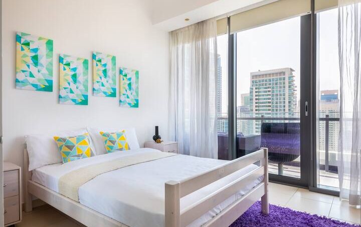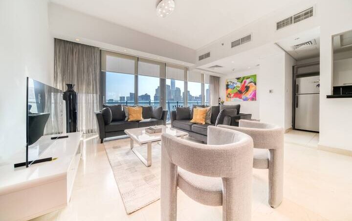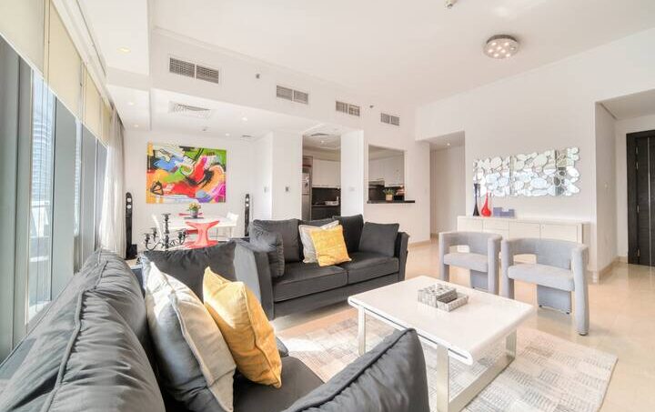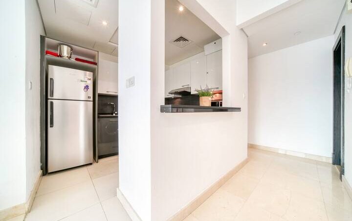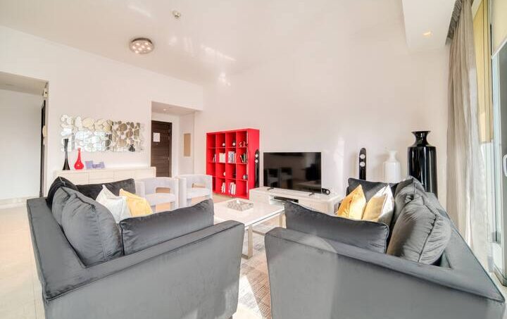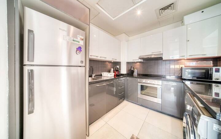 A room generous in light and comfort alike, the living area is an open space that features a large corner sofa to seat the whole family with coffee table and Tv and dining table that seats four comfortably. The whole room has access to the apartment’s furnished balcony with a stunning full Marina view. The kitchen is fully fitted with all the necessary appliances needed for a seamless Dubai stay and features a breakfast bar.