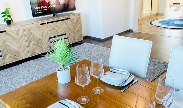 The apartment includes 2 big bedrooms, 1,5 bathrooms, a fully equipped kitchen, a dining part, a large living room and 270 degrees large terrace.