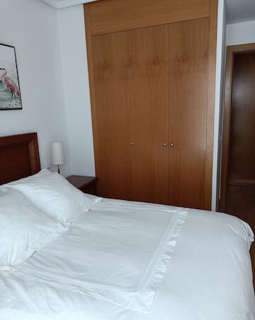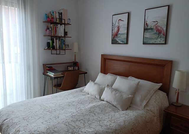 It has 1 bedroom with a double bed (135cm), a built-in wardrobe, two chests of drawers, a desk for working and a small balcony.
