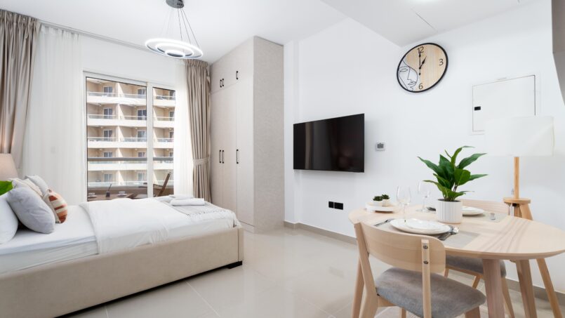 Step into a thoughtfully furnished studio featuring a cozy dining corner for two, a smart TV in the living space, a coffee table for your quiet moments, and a plush queen-sized bed for restful nights.