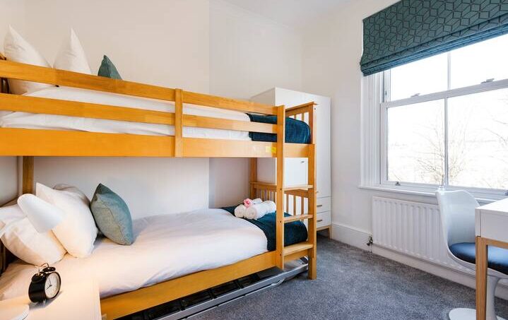 This unique apartment has two bedrooms, the first bedroom is equipped with a king size bed, the second bedroom has 2 single bunk beds (adult rated), and there is double sofa bed in the living room. Each bedroom has a wardrobe with plenty of space to hang clothes and store away your belongings. The bathroom is modern, with a shower over bath. And the combination boiler means you will never run out of hot water! There are also USB power points in every room allowing convenient charging of electronic devices.