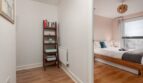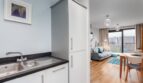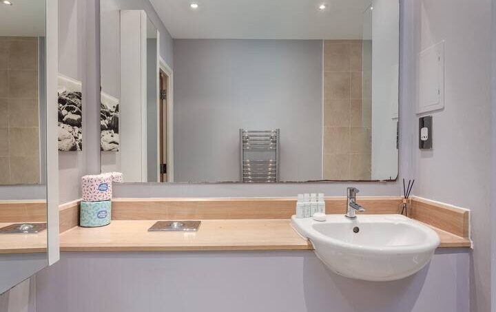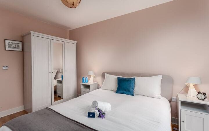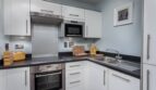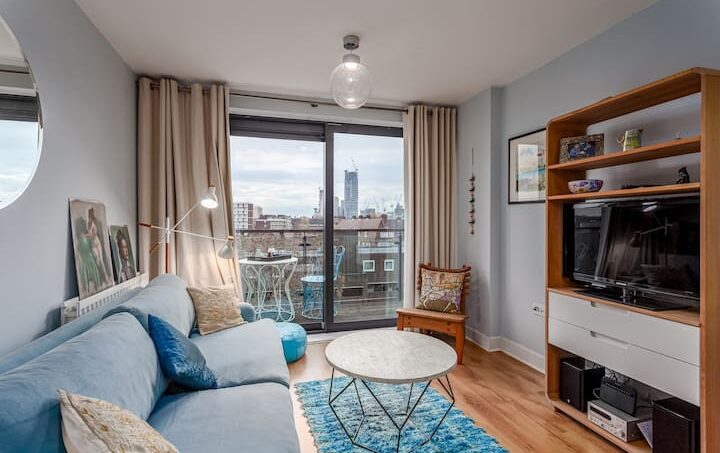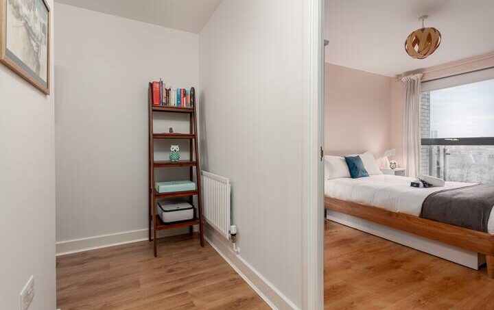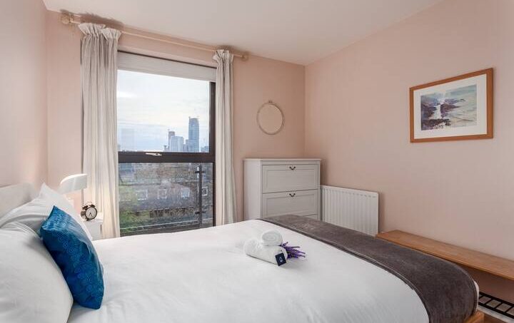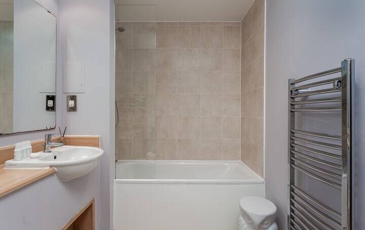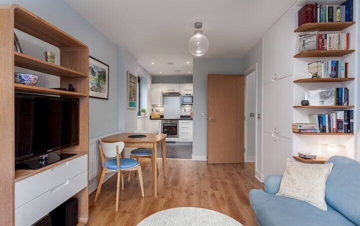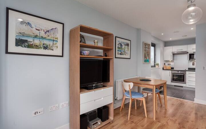 The living room has a very comfortable ‘Loaf’ sofa and coffee table, making it an ideal place to relax and enjoy your stay. The dining table seats two people and can be expanded to seat four. The kitchen is fully equipped, so you can prepare favorite snacks or gourmet meals. The bright bedroom is equipped with a king-size Heals bed and Vi-Spring mattress and has a blackout blind. The bathroom contains a bath with overhead shower.
