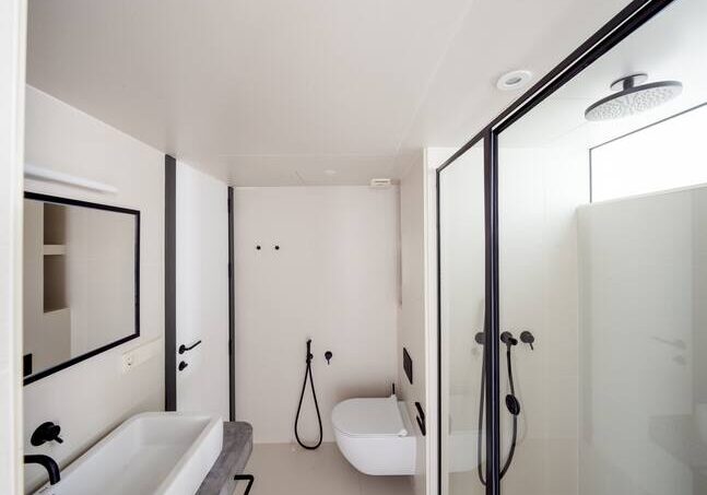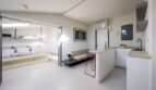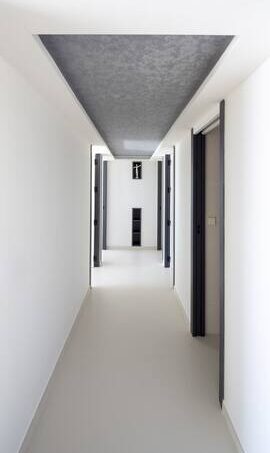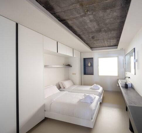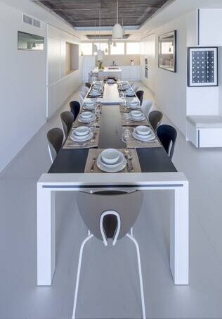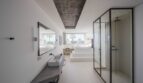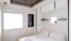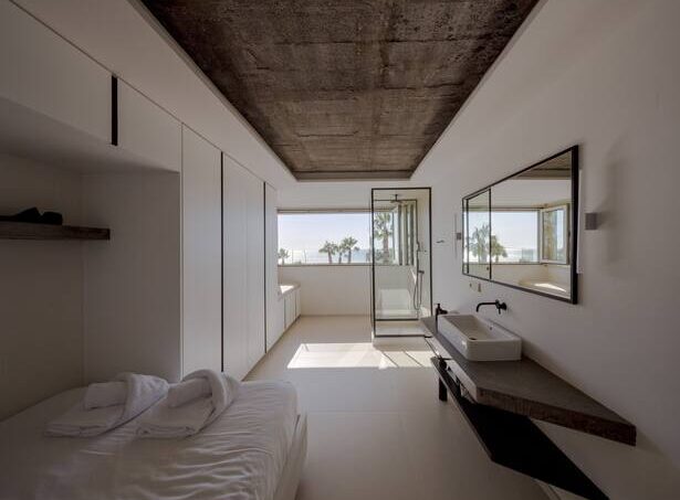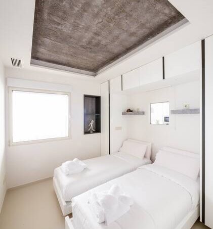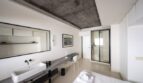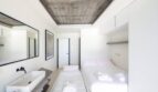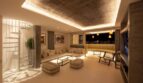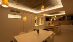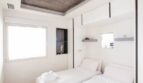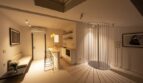 The front bedrooms with their panoramic windows are equipped with stylish showers and ensuite toilet, as is the third bedroom. The fourth bedroom shares access to the main bathroom. Its module structure of the bedding allows you to adapt them to your needs. On the upper floor you find the fifth bedroom with its big king size futon and a fully equipped bathroom. You also can enjoy the built-in bar, the office space and the home cinema.