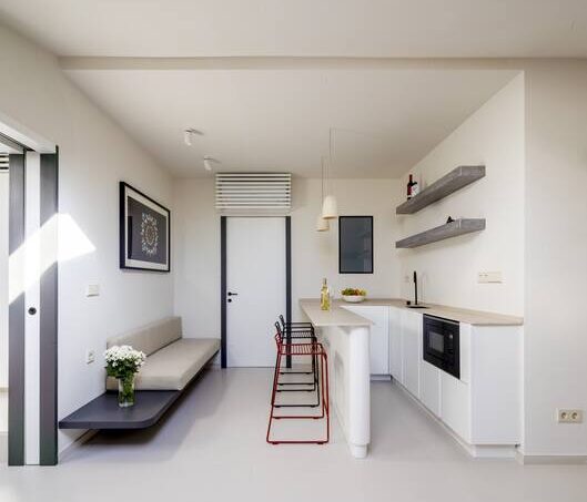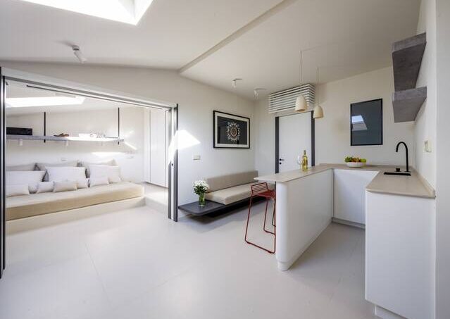 The bright living area invites you to enjoy all together, opening up to the dining area and the modern American kitchen that provides you with all amenities on the reach. For your comfort, up to two parking spots are available in the same building.