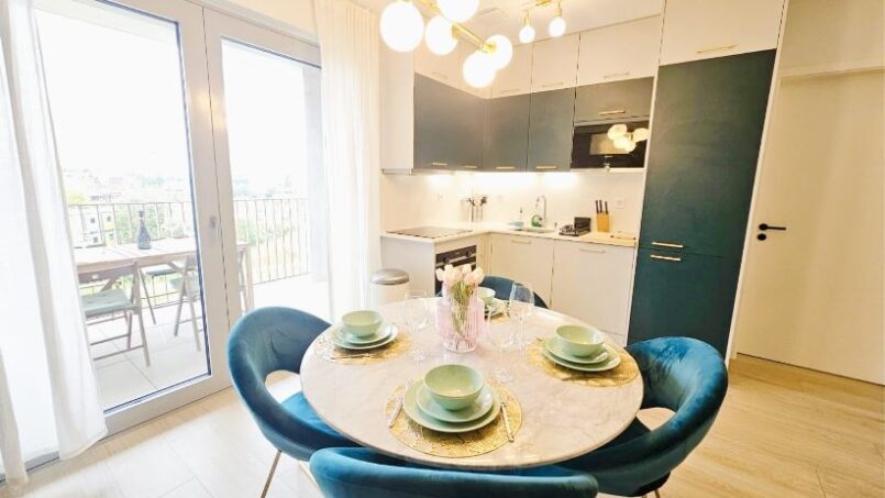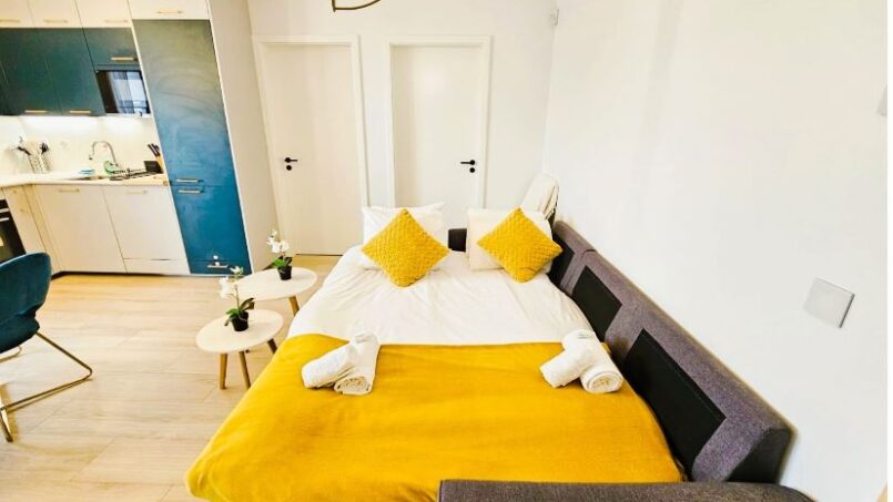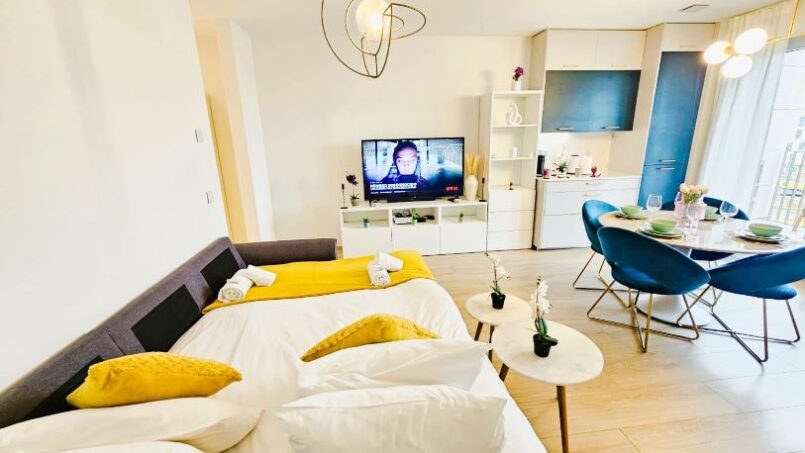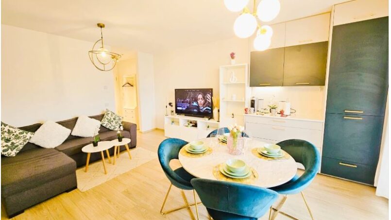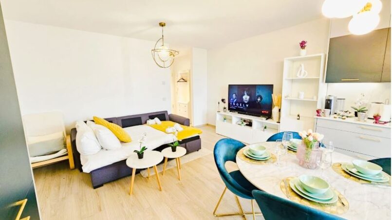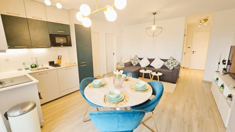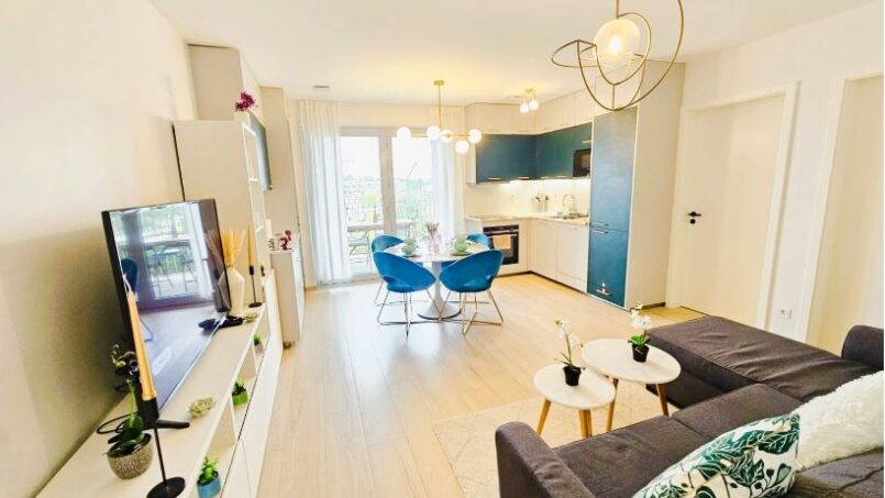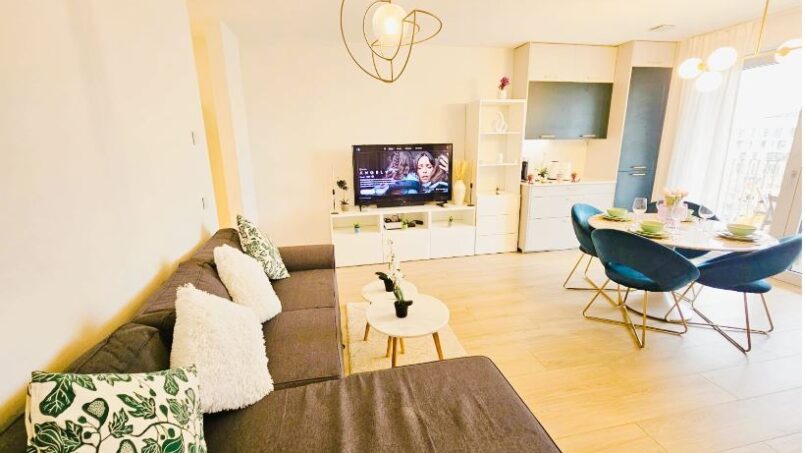 The apartment features two comfortable bedrooms with high-quality bedding, a double sofa bed, a fully equipped kitchen with modern appliances, and a sleek bathroom.