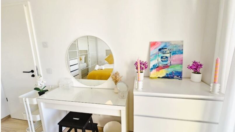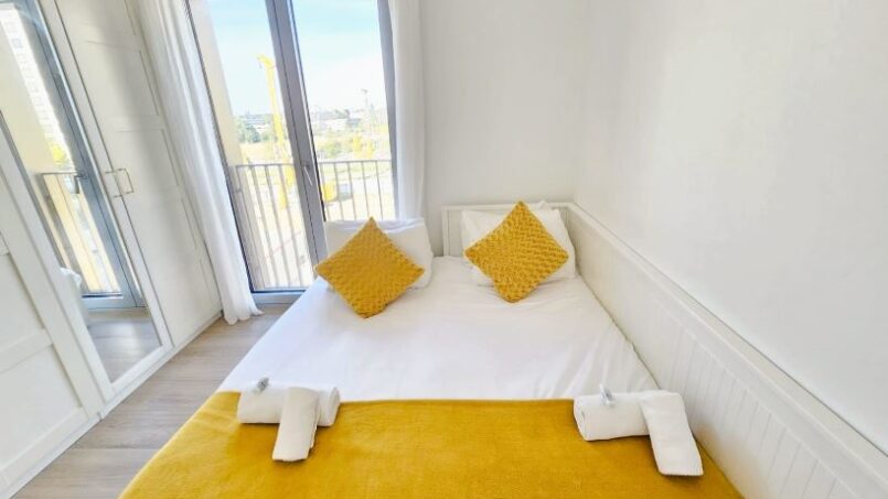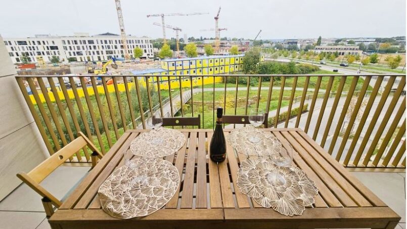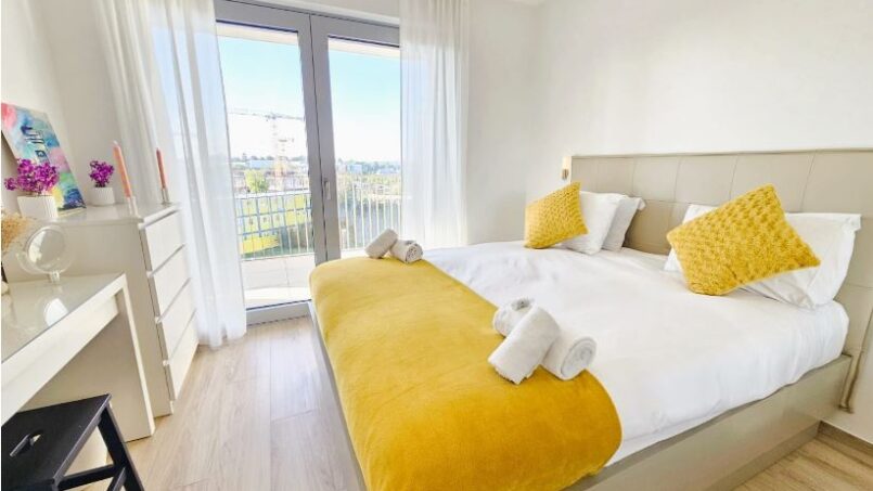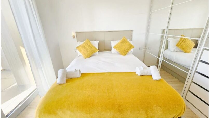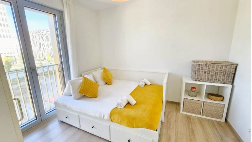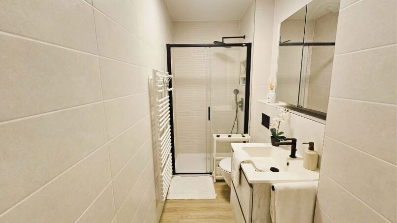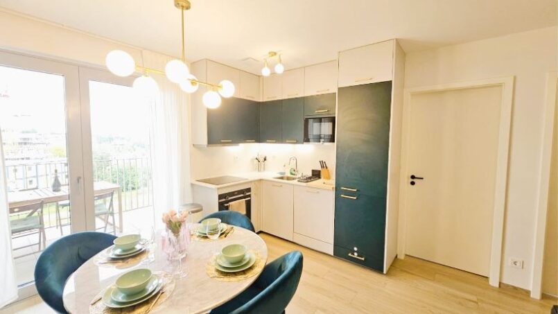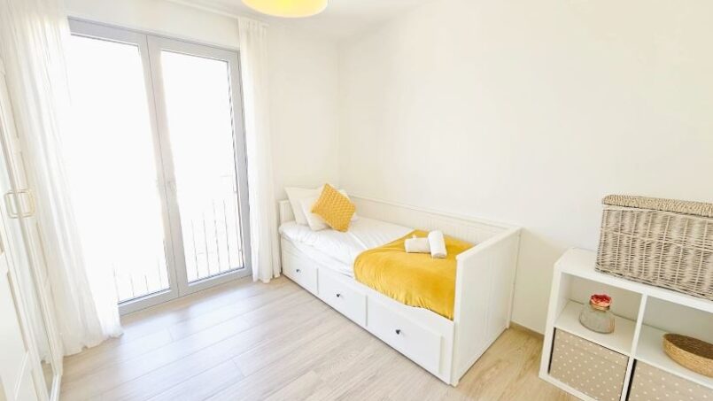 The apartment features two comfortable bedrooms with high-quality bedding, a double sofa bed, a fully equipped kitchen with modern appliances, and a sleek bathroom.