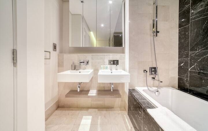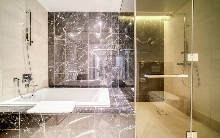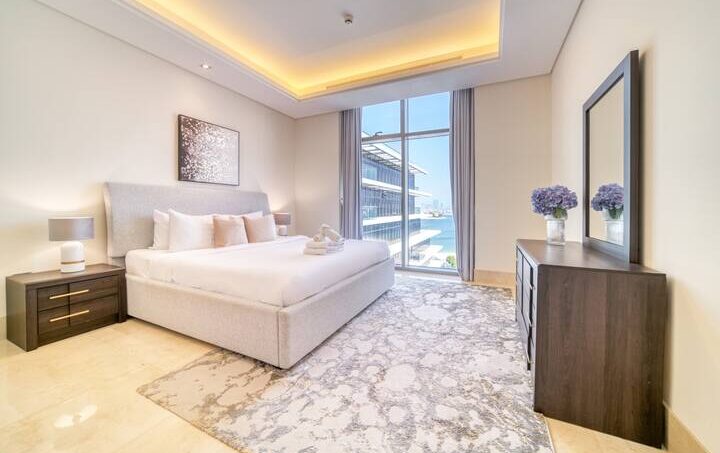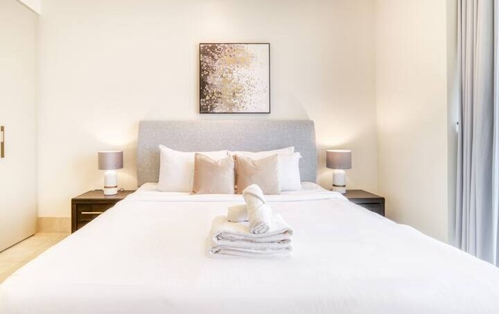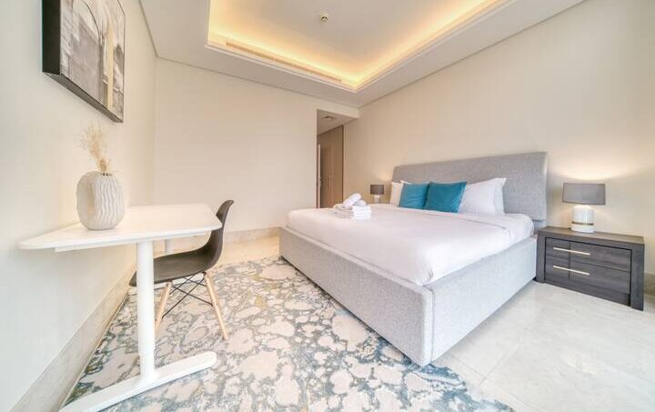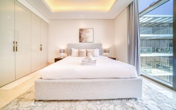 Had your fill of Dubai adventures? Well, this bedroom is your serene oasis. Picture perfect walls and decor that’ll soothe your soul. How about sinking into the sprawling king-size bed, wrapped in luxurious linens and plump pillows, all while enjoying the breathtaking view through those towering windows? Your wardrobe and trusty drawer dresser stand ready to guard your belongings, granting them a safe haven during your stay. And when it’s time to drift into dreamland, step into the ensuite bathroom for a rejuvenating shower, or perhaps a soak in the tub, turning your bedtime routine into a spa-like escapade.