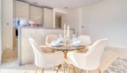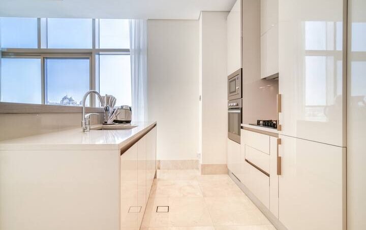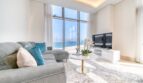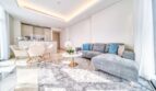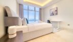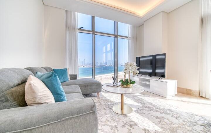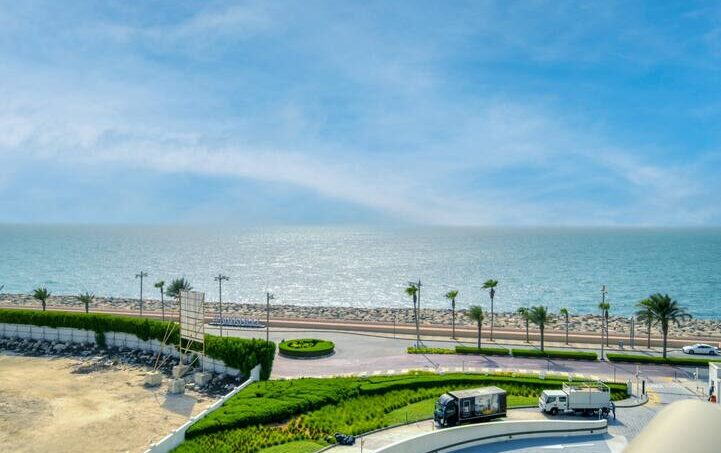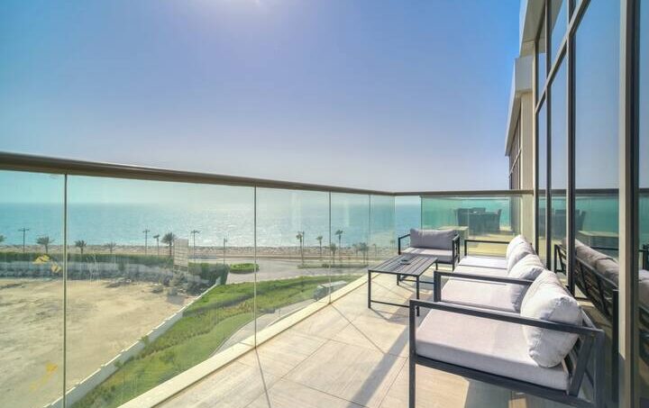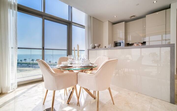 Prepare to be amazed by the jaw-dropping space and breathtaking views that await you in the expansive living area, thoughtfully connected to the kitchen and dining space. If you ever tire of keeping up with your favorite sports or Netflix shows, simply sink into the plush sofa and soak in the beachfront vista. When hunger strikes, venture into the well-equipped open kitchen boasting a fridge, gas stove, oven, microwave, toaster, and electric kettle. Worried about the cleanup? Fear not, as a dishwasher and washing machine are on hand to make it a breeze. As night falls, anticipate the moment you’ve been waiting for. Relax on the expansive balcony, where the soothing sounds of the waves blend harmoniously with the spectacular Dubai skyline. Engage in heartfelt conversations with your loved ones or take a moment for self-reflection; the choice is yours.