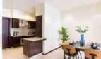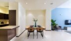 A calm and tranquil space great for quiet evenings in and for preparing action-packed days out. The compact open-planned apartment offers a great flow with floor to ceiling windows that open out to a spacious furnished terrace with community views. Featuring a sofa, accompanying chair, TV and four-seater dining table it’s a well-measured, multifunctional room.