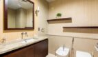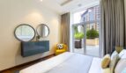 The master bedroom is a contemporary and cosy room with a carpeted floor and modern art in a fresh and vibrant style. Furnished with a king-size bed and premium bedding, bedside tables with lamp lighting and floor to ceiling windows. The room has a dressing chair, a vanity table and an en suite bathroom including a toilet and fitted tub with shower installed.