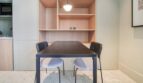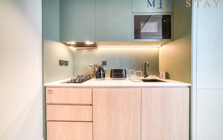 This space effortlessly blends modern convenience with a laid-back coziness. Sunlight floods through the balcony, offering captivating views of the Burj Khalifa and the city. There’s a palpable positivity in the air, encouraging you to embrace it all. Visualize yourself sinking into the super comfy sofa, conveniently placed near a stylish coffee table—ideal for your books or Netflix snacks. The fully equipped kitchen, complete with a kettle, stove, microwave, toaster, and a Nespresso machine for your coffee cravings, has everything you need. The dining table provides a perfect spot for a quick meal. Let the washing machine take care of your laundry.