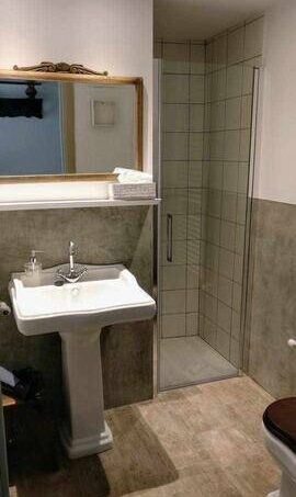 Bathroom with hairdryer, shampoo, body and hand soap.