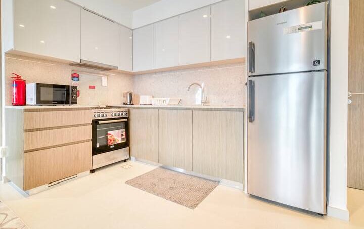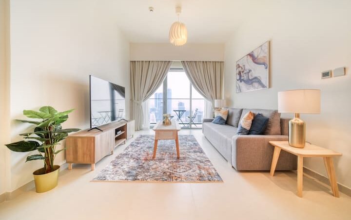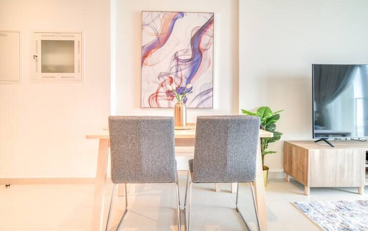 Get ready to fall in love with the modern comfort of this apartment. The living area greets you with abundant natural light streaming in through the expansive balcony windows, offering stunning city views. If you’re a binge-watching enthusiast, cozy up on the sofa in front of the generous 65-inch TV, complete with a stylish wooden center table. When hunger strikes, the fully equipped kitchen is at your service, featuring a fridge, gas stove, oven, microwave, toaster, and electric kettle.
