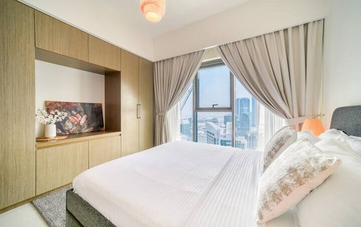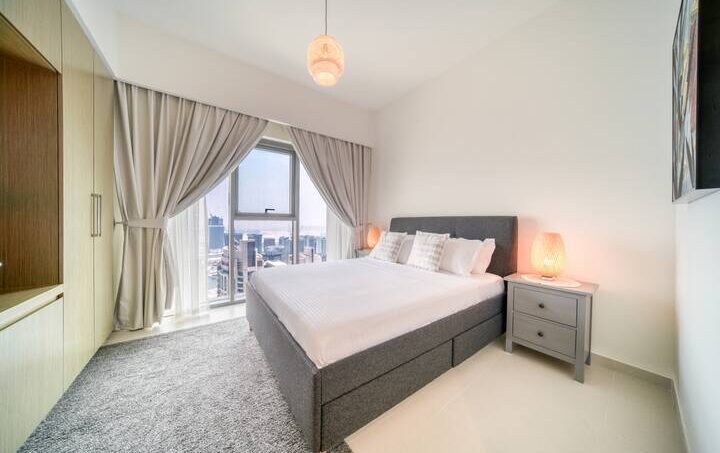 An interior bathed in natural light, complete with a balcony that offers stunning city views and a partial glimpse of the water canal. Beyond the lavish interior and handpicked furnishings in your living space, kitchen, and bedroom, you’ll have access to top-notch amenities like a pool and gym. As a bonus, it is surrounded by parks and lush green fairways, offering a host of luxurious facilities. Plus, you’re only minutes away from The Dubai Fountain, The Dubai Mall, and the Dubai Opera.