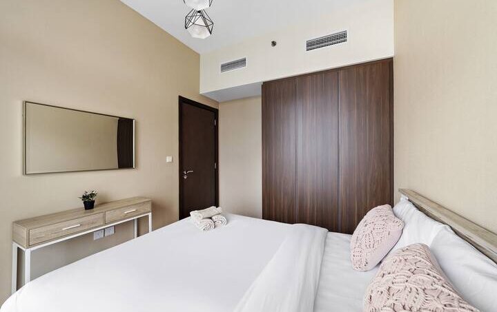 Our 1-bedroom apartment is a perfect escape for a single traveler or couples. Situated in a brand new Vera Residences by Damac, the property features lots of daylight and beautiful art deco pieces. Apartment is equipped with all the essentials needed for a modern traveler. Our guests can enjoy an access to a swimming pool and a gym located on the property.