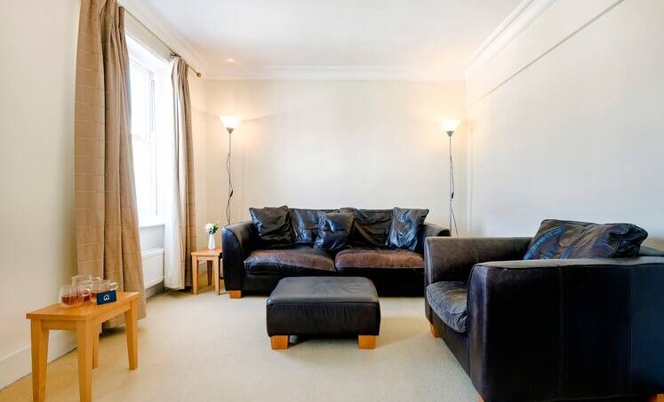 The living room is equipped with a sizeable sofa and armchair and the fully fitted kitchen comes with modern built-in appliances (dishwasher, microwave, gas cooker, fridge, freezer, kettle and toaster). The master bedroom has a double size bed, wardrobe and chest of drawers. The apartment also features a bathroom, (bathtub with overhead shower), basin and WC