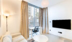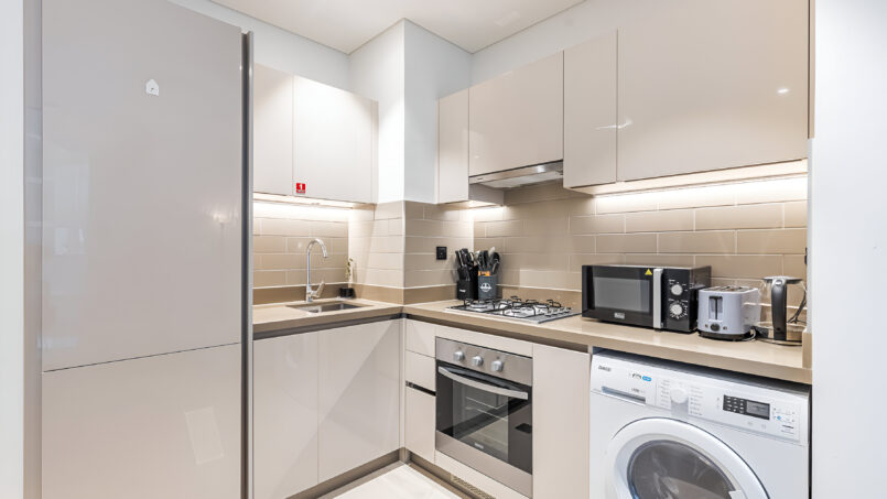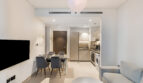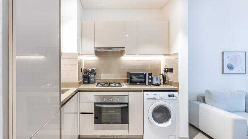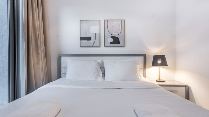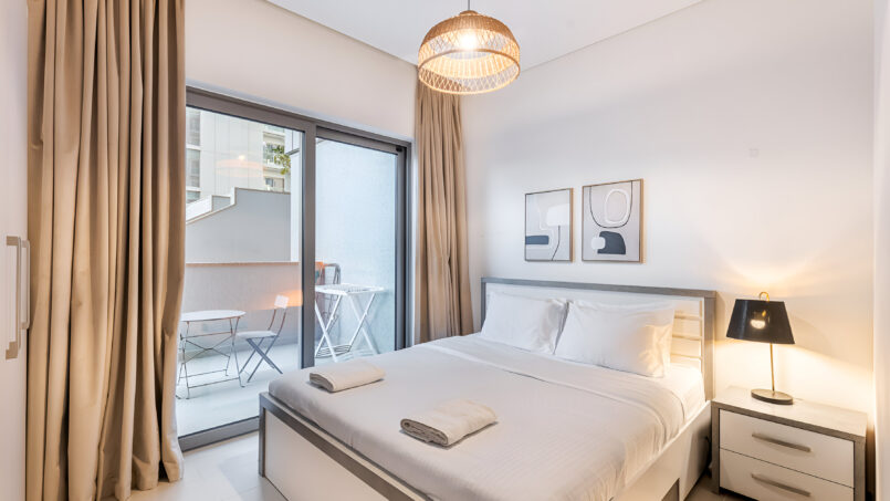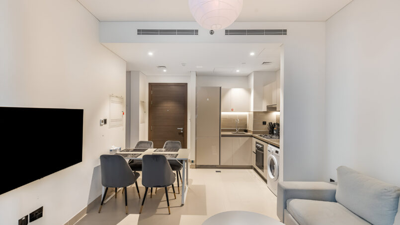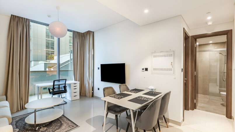 Discover the modern & stunning 1 bedroom apartment with perfect light fixture, streamlined furniture, and neutral colors that ensure a calming, laidback, and stylish environment. Thoughtfully designed apartment is spacious with plenty of light emitting through the balcony. It features a spacious and open kitchen, fully equipped with all the appliances. The living room consists of a large sofa-bed , Tv, dining area & an office desk.