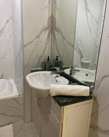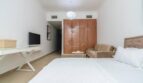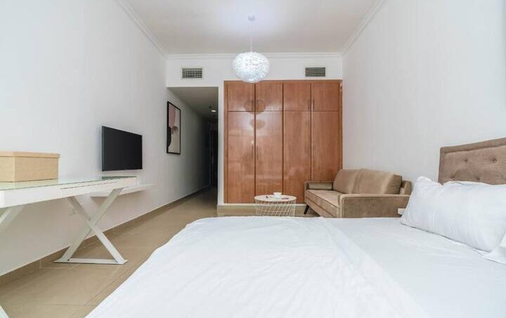 the studio features 1 room with queen sized bed , side tables with lamp, a wardrobe, sofa , As well en-suite bathroom with bathtub and shower, including toiletries and essentials , centre table, big flat screen tv with cable