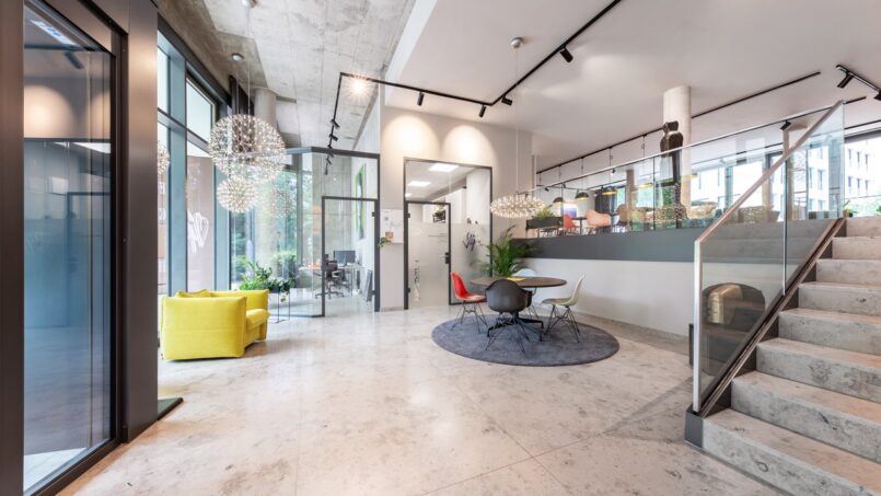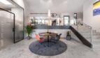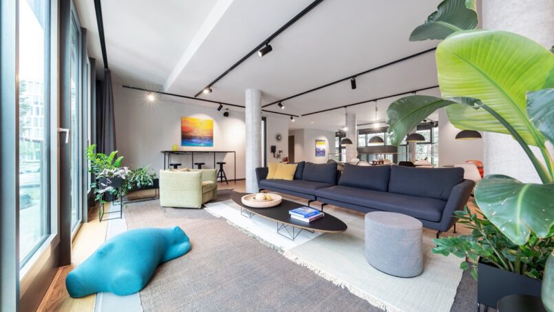You will not only have the opportunity to exchange ideas in the bright hall on the first floor, where the reception and the Vitra lobby are located, but also at a lofty height: on the roof there is a green terrace, which invites you to relax in a sheltered environment – or to take part in events from time to time. For example, to the vernissages of the young artists who exhibit their works in our building.